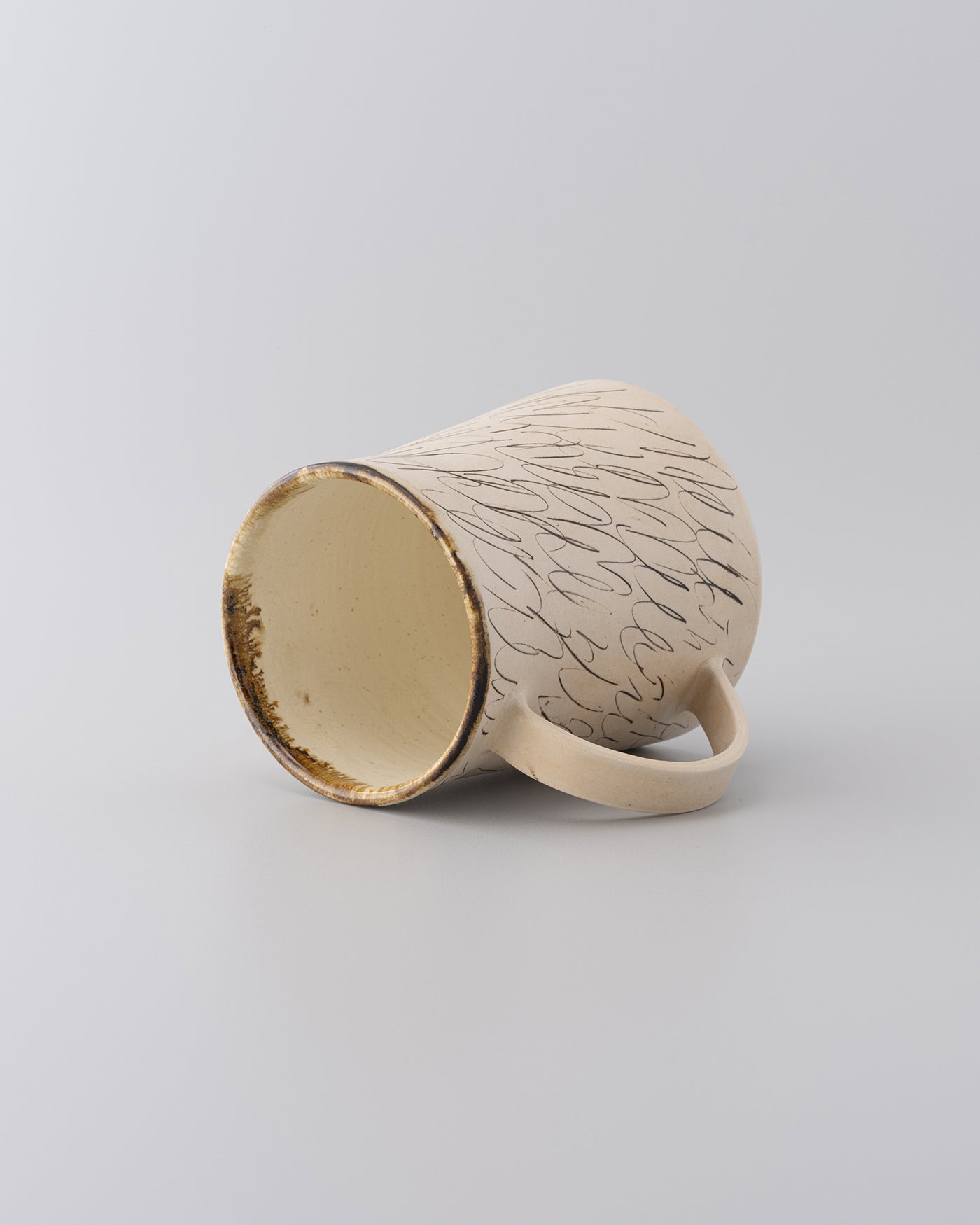 This cup is made by Chie Fujii, a ceramic artist living in Los Angeles, U.S.A. The hand-painted drawings on the ceramic cups give them a playful feel, and their thickness makes them ideal for hot beverages such as coffee and tea. The cups are a little out of the comfort of symmetry, and the joy of finding beauty in imperfect shapes.
