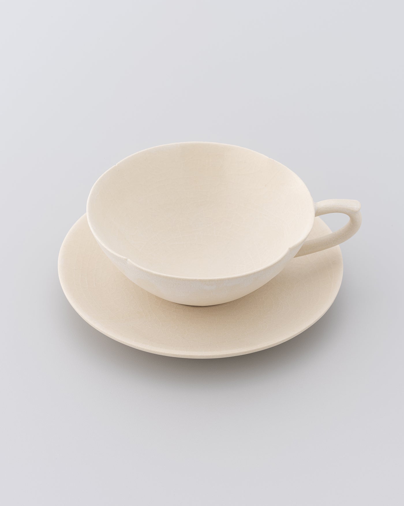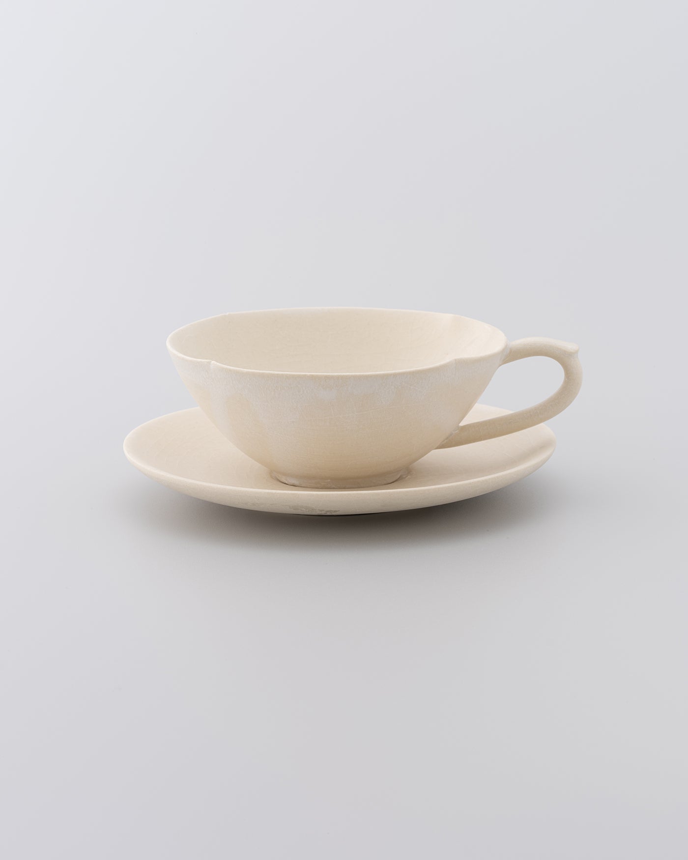 陶芸家・佐藤朱理のカップアンドソーサー。独自の楽焼釉と土の重なりによるマットな質感と、静かな景色。
