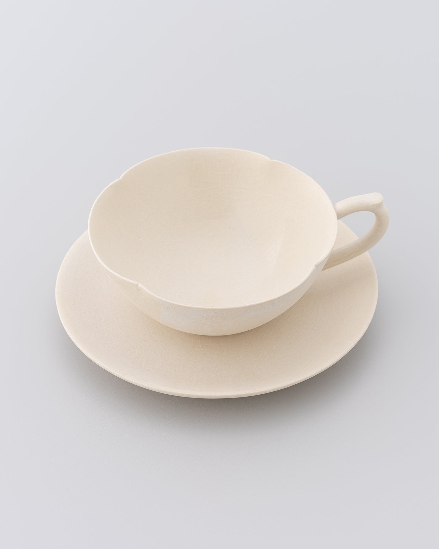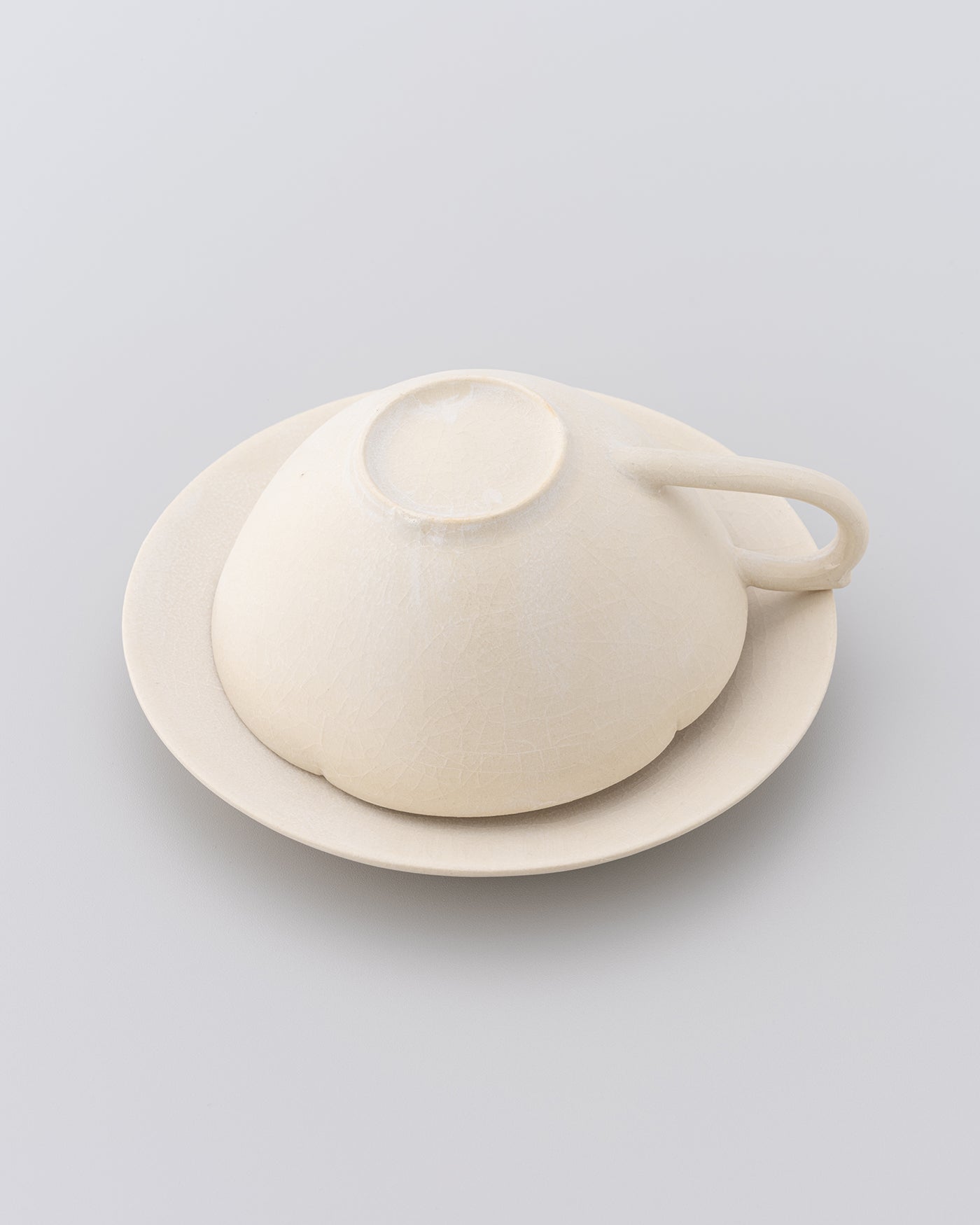 陶芸家・佐藤朱理のカップアンドソーサー。独自の楽焼釉と土の重なりによるマットな質感と、静かな景色。