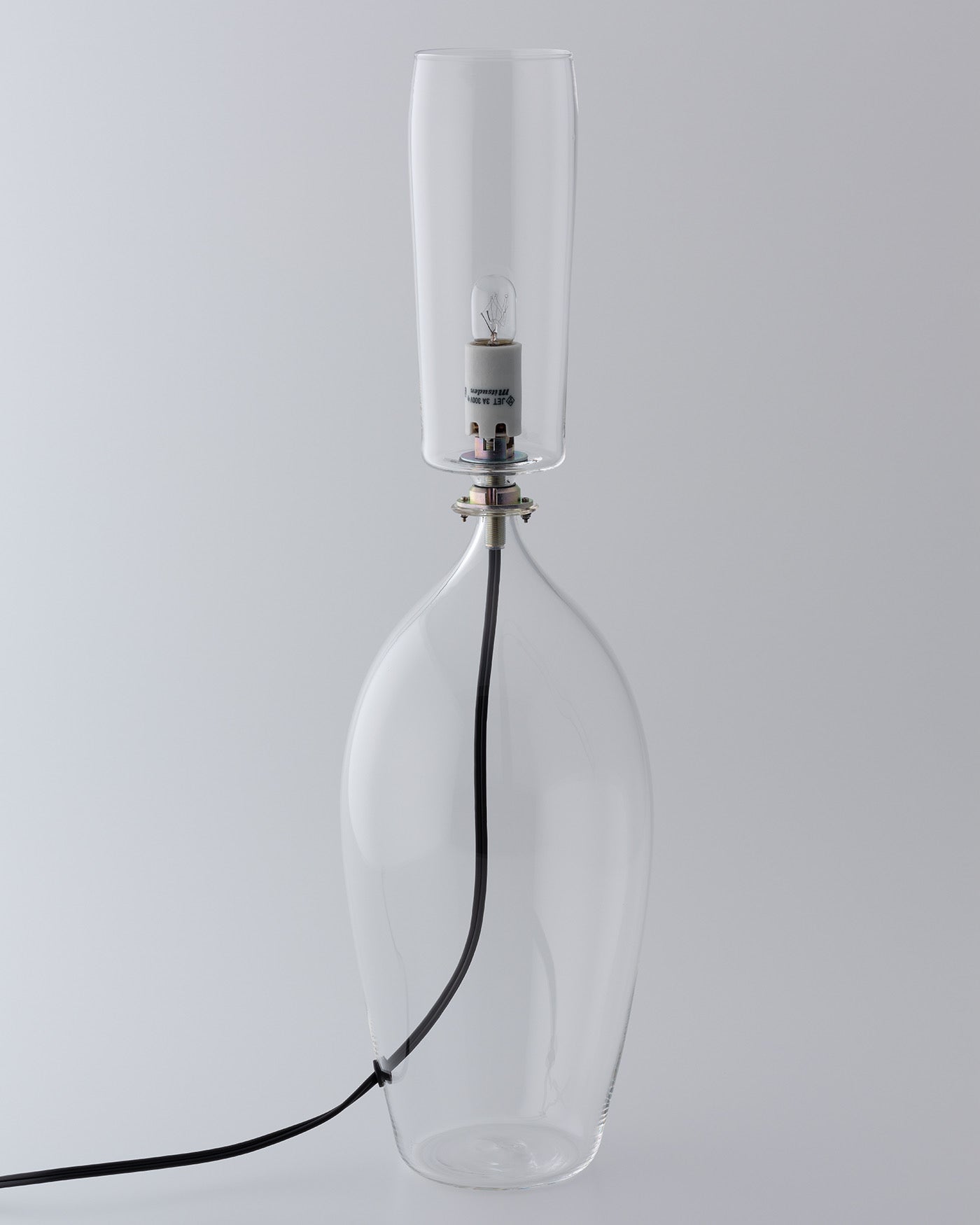 マウスブローによるやわらかなガラスの膨らみと、インダストリアルな部品のバランスが空間に美しい緊張感を作り出す。ガラス作家・林亜希子による "screwed work"。